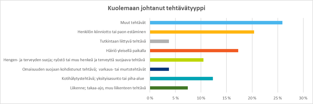 Poliiseille vaarallisimpina tehtäviä ovat olleet henkilön kiinniotto tai paon estäminen, häiriö yleisellä paikalla ja kotihälytystehtävät. Omaisuuden suojaan kohdistuvilla tehtävillä tarkoitetaan esimerkiksi pankin tai liiketilan ryöstöä, jossa poliisi on usein päässyt yllättämään tekijät. Kotihälytysten riskejä lisää, kun partio menee lähtökohtaisesti heille tuntemattomaan paikkaan, jossa on monia mahdollisia surmavälineitä. Poliisin sodanaikaisia väestönsuojeluun ja ilmahälytyksiin liittyvät tehtävät muodostavat luokan muut, ja osoittaa selkeästi sota-ajan olleen kotirintaman poliisikunnalle raskas.